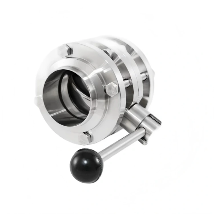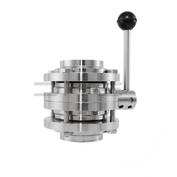 Den sanitära 3-delade vridspjällsventilen använder högprecisions CNC-bearbetningsteknik, med premium SUS304 (1.4301) eller SUS316L (1.4404) rostfritt stål, med bearbetningstoleranser kontrollerade inom ±0,01 mm. Både inre och yttre ytor är spegelpolerade, med en innerväggsråhet på Ra≤0,4μm (precisionen kan ökas vid behov), vilket eliminerar sanitära döda hörn. Den uppfyller GMP- och EHEDG-standarder och stöder CIP-rengöring online och SIP-ångsterilisering vid hög temperatur.